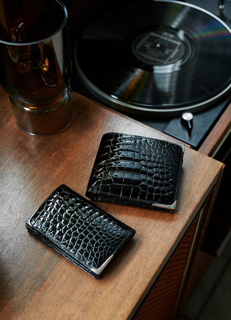 日本のクラフトマンシップが息づく革ブランド〈キプリス〉のウォレットとカードケース。艶やかで美しく揃ったクロコダイルの鱗を、表面だけでなく内装にも贅沢に使用している。手に取るだけで、気分も自然とクラスアップする逸品だ。