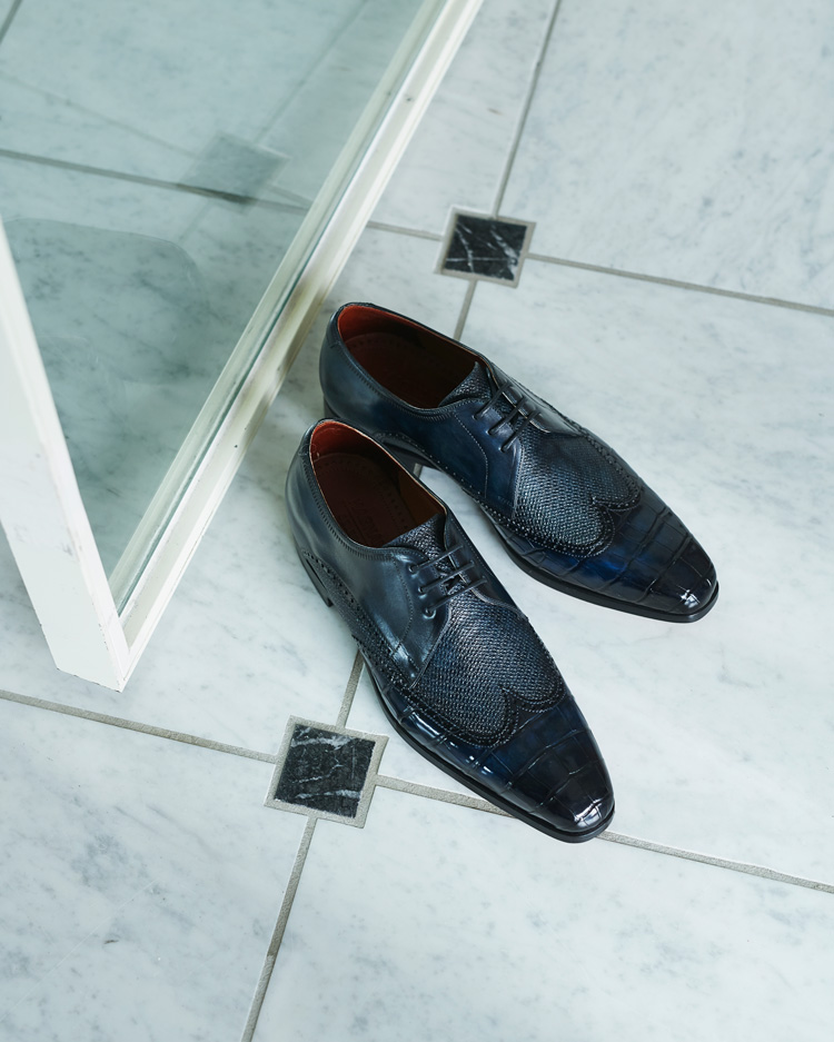 1954年にスペインで創業し、3世代にわたり受け継がれてきた高級紳士靴ブランド〈マグナーニ〉。アリゲーターとリザードの型押しを施したこのドレスシューズは、装いに取り入れるだけでコーディネートを格上げしてくれる。
