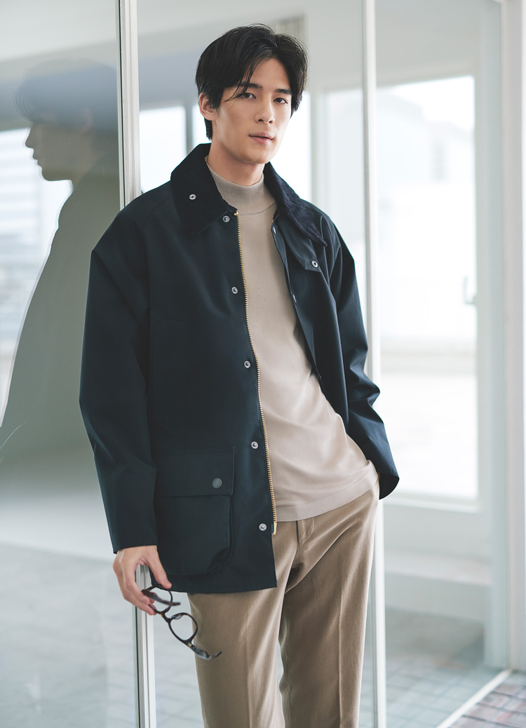 〈バブアー〉のブルゾンは、ラグランスリーブやサイドベンツ、袖口のリブといった乗馬用コート由来のディテールを踏襲しつつも、撥水性に優れた2レイヤー素材を採用。実用性を高めながら、モダンなルックスに仕上げている。