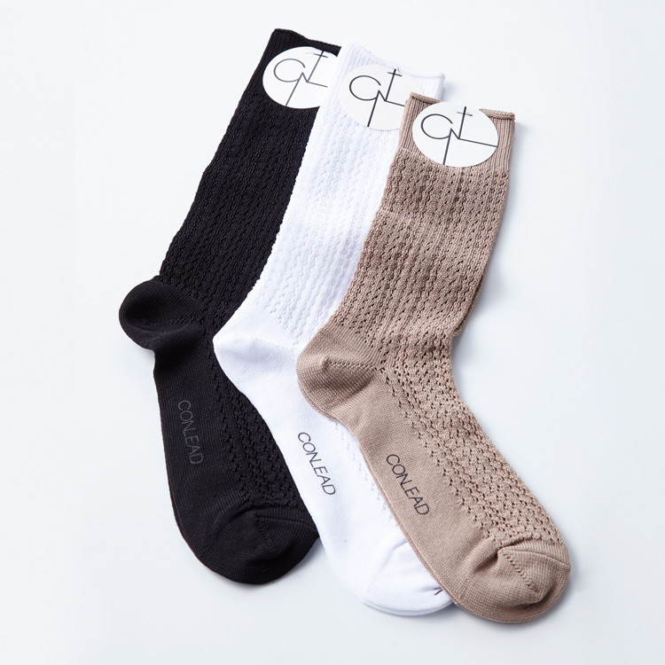 〈コンリード〉は、映画の名脇役のように確かな存在感を放つソックスをコンセプトにした日本のブランド。シグネチャーモデルであるレースソックスは、コーディネートに上品なアクセントを添えてくれる。
