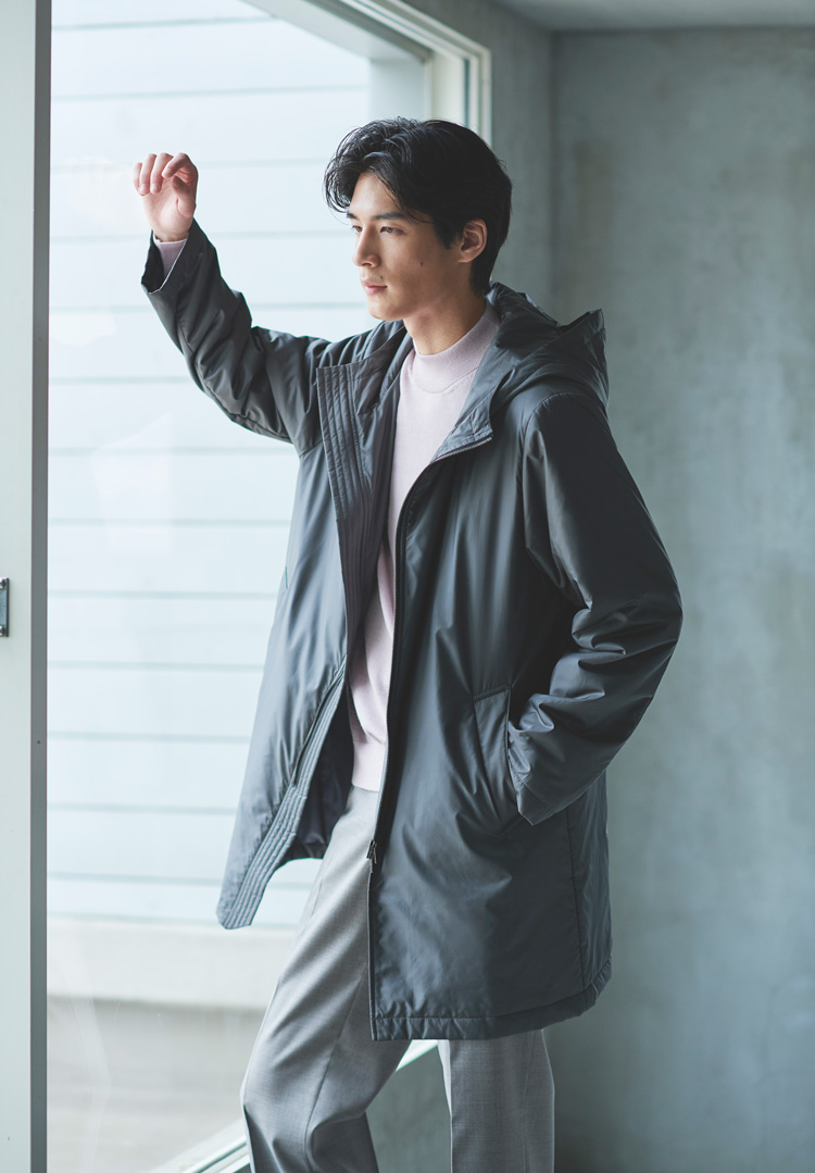 表地には防風性に優れた薄手素材を使用し、内側には中わたを薄く配した〈ピエール・カルダン〉のコート。ダブルファスナー仕様で着脱もスムーズだ。モードな表情と機能性を両立した、冬から春の季節の変わり目に重宝する一着だ。