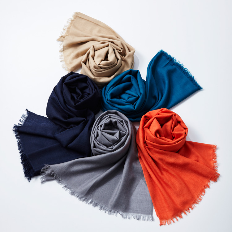 首元には、上質なウールを使用した〈ロバートフレイザー〉の大判ストールを合わせ、さりげなくエレガントなアクセントをプラス。