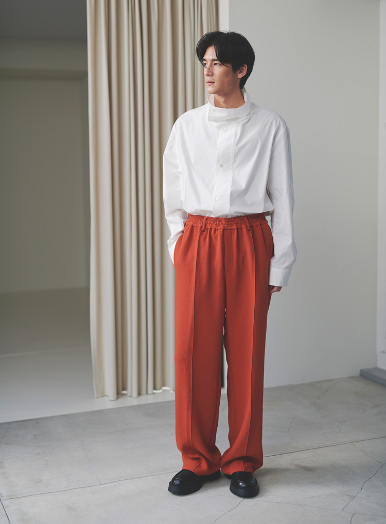 独自のパターン技術とパンツ専業工場による丁寧な仕立てで、美しく立体的なシルエットを追求する〈バラード〉。春を先取りしたビビッドカラーのパンツは、リラックスした穿き心地も魅力。ひと際目を引くカラーで、スタイリングを晴れやかに彩ってくれる。