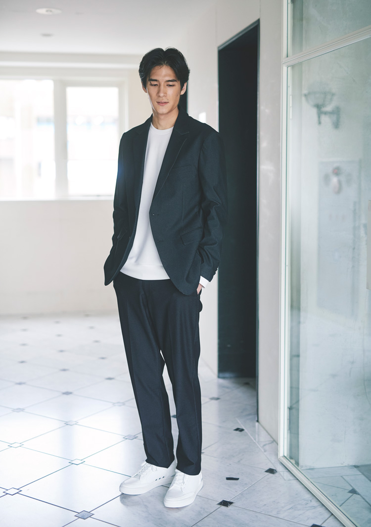 日本の様式美を背景に、時代性を取り入れた服作りを行う〈コムサ・メン〉。デニム見えするジャージー素材のセットアップは、360度ストレッチによる快適な着心地が特徴。シワになりにくいため、普段使いはもちろん、出張や旅行でも活躍する。
