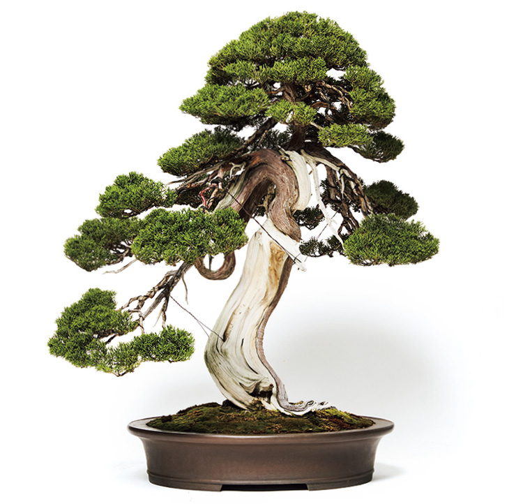 枯れた白い幹「舎利」に、生きた幹「水吸い」が絡みつく。生と死のコントラストが際立つ「真柏」は、展覧会などでも非常に人気の高い樹種。